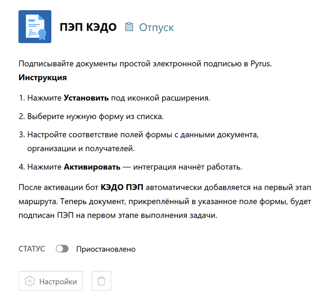 - Чтобы приостановить прием подписанных ПЭП заявлений сотрудников в Pyrus, на странице настроек расширения переведите переключатель в положение Приостановлено.