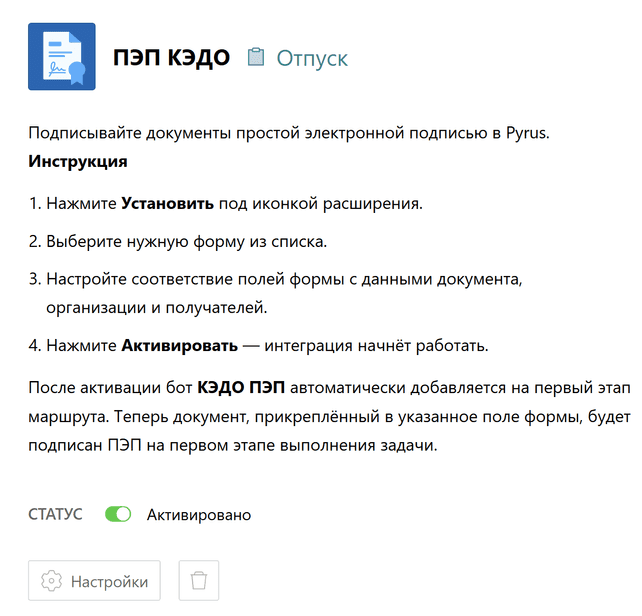 Расширение ПЭП КЭДО в Pyrus позволяет организовать электронное подписание кадровых документов простой электронной подписью (ПЭП).