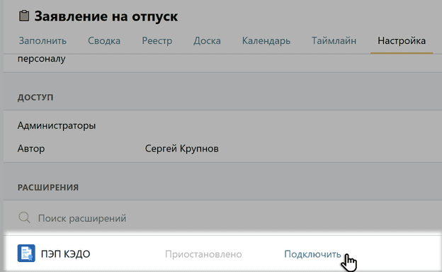 При создании форм из готовых шаблонов Pyrus КЭДО, расширение уже подключено. Если вы используете собственную форму, подключить расширение можно в её настройках.