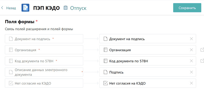 Перейдите в настройки формы. Выберите ПЭП КЭДО в списке доступных расширений.