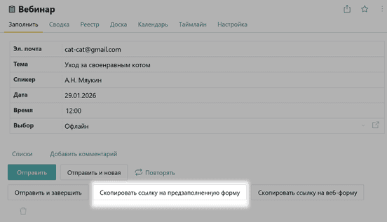 Например, для формы приглашения и регистрации на вебинар можно добавить поле с выбором формата вебинара – офлайн или онлайн. При заполнении формы для каждого формата формируется своя ссылка на веб-форму.