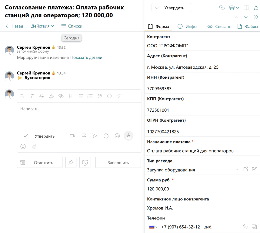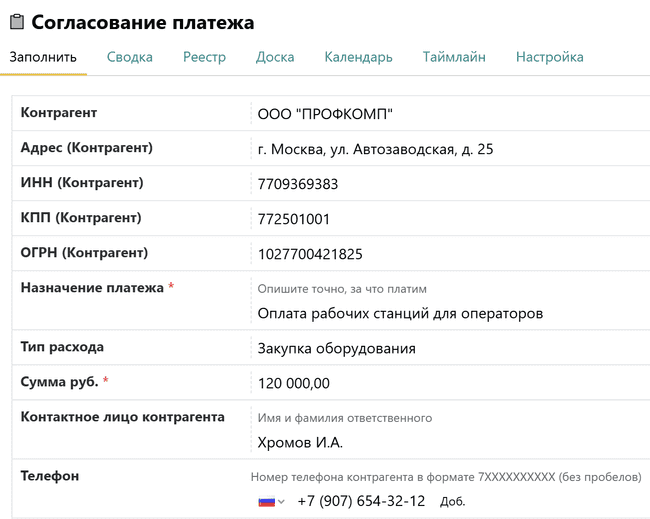 Как обычно происходит: создается простая форма заявки на платеж. Сотрудник заполняет ее и нажимает Отправить: