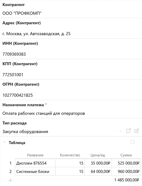 С таблицей форма заявки на платеж стала значительно нагляднее и удобнее для корректировок.