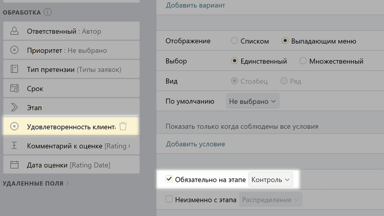 Например, на этапе 3 (контроль обработки претензии) отмечаем обязательным к заполнению такие поля как Удовлетворенность клиента решением и, на этапе 2 (обработка претезии) поле Срок. Таким образом, сотрудники не пропустят просрочки претензии и усугубления ситуации, а руководитель отдела сможет быстро отслеживать такой важный показатель, как согласие обратившихся с претензией с решением по ней.