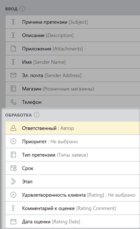 Чтобы на этапе распределения оператор не видел лишние поля, которые заполняет специалист уже в процессе или после принятия решения по претензии, разместите их в блоке Обработка. Они не будут видны в заявке на этапе заполнения, но появятся в ней на этапе, когда заявка уже взята в работу.