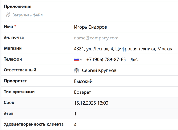 Клиент обратился с претензией, и сотрудник отдела поддержки клиентов заполнил соответствующую форму Pyrus.