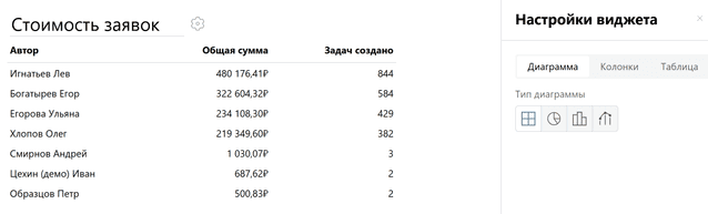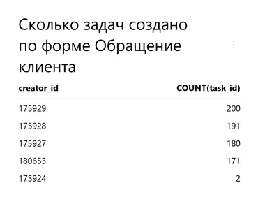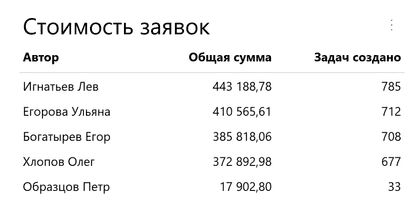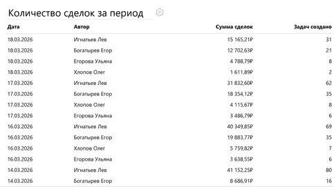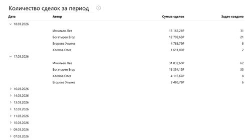 SELECT DATE(create_date) AS "Дата", creator_id AS "#person_full_name('Автор')", SUM(${Стоимость заявки}) AS "Сумма сделок", COUNT(task_id) AS "Задач создано" FROM #tasks WHERE DATE(create_date) >= @period_start AND DATE(create_date) < @period_end AND #task_filters GROUP BY DATE(create_date), creator_id ORDER BY DATE(create_date) DESC, COUNT(task_id) DESC LIMIT 100;Нажмите Выполнить. Вы увидите количество задач, созданных каждым сотрудником на каждый день за выбранный интервал в фильтре, а также суммы заключенных ими сделок, представленные в виде таблицы.