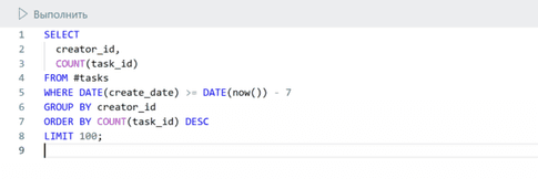 SELECT creator_id, COUNT(task_id) FROM #tasks WHERE DATE(create_date) >= DATE(now()) - 7 GROUP BY creator_id ORDER BY COUNT(task_id) DESC LIMIT 100;