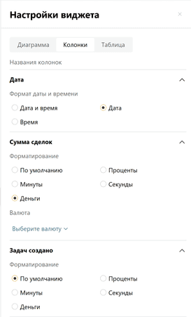 Визуальное отображение самих значений (например, как представляются число или дата) можно изменить через настройки виджета. Чтобы видеть в отчёте сумму сделок в рублях, выберем для данных типа Деньги соответствующее форматирование, а также укажем валюту.