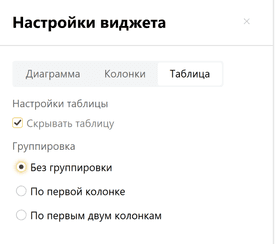 Данные из формы в виде Таблицы визуализируются всегда — вне зависимости от выбранного формата отображения. В иных типах отображения таблицу можно скрыть под выбранной диаграммой. Для этого откройте раздел Таблица в настройках виджета и установите соответствующую галочку.