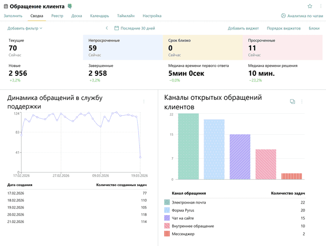 Виджеты, созданные с помощью SQL по определенной форме, располагаются в разделе Сводка этой формы. Для удобства, эти персонализированные виджеты размещаются выше стандартных виджетов Pyrus.