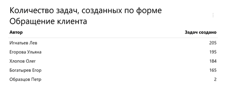 Нажмите Выполнить. Вы увидите таблицу с общим количеством задач, созданных за последние 7 дней разными сотрудниками.