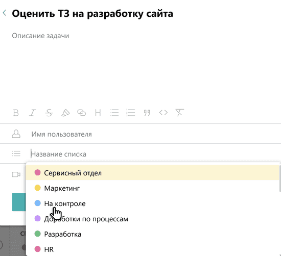 Списки помогают группировать задачи, чтобы было проще в них ориентироваться и делиться ими с коллегами. Например, вы можете создать список задач по конкретному проекту, клиенту или для определенной команды специалистов.