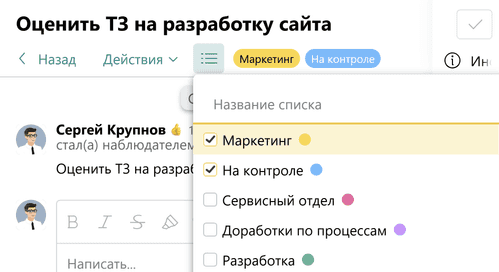 - если задача уже есть в Pyrus, можно указать, в какие списки она входит, на ее странице;