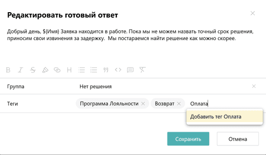 Чтобы добавить тэг, откройте готовый ответ в режиме редактирования, введите нужные тэг/и и нажмите Сохранить.