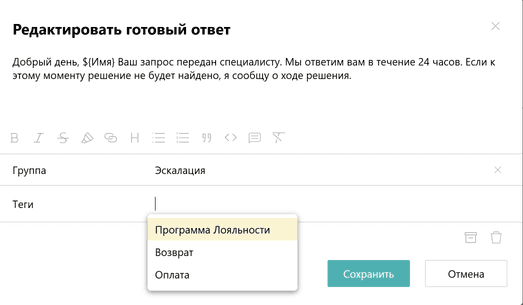 В готовый ответ можно добавить тэги — для быстрого поиска нужного ответа при обращении клиента. Это удобно, когда у компании множество готовых ответов по одной теме. Например, у вас несколько онлайн-магазинов и клиенты каждого из них обращаются по вопросам программ лояльности, работы личного кабинета, оплаты, возврата товаров и т.д.