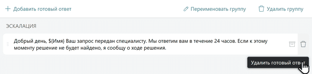 Чтобы подготовить ответ, выберите слева группу и нажмите Добавить готовый ответ. Во всплывающем окне введите текст ответа и сохраните его.