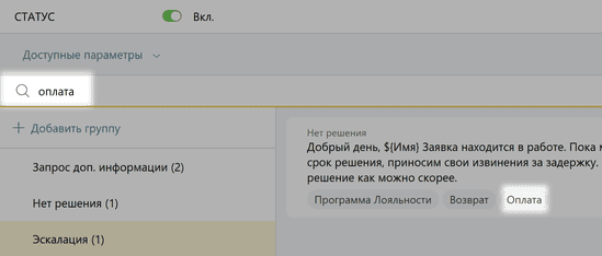 Здесь вы найдете список доступных параметров-плейсхолдеров, таких, например, как имя и фамилия клиента, его телефон и т.д. Их можно вставить в шаблоны готовых ответов, чтобы нужная информация из заявки клиента подгружалась автоматически.