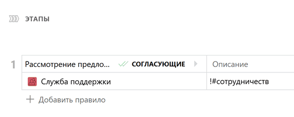 Важно: для заявок, созданных после добавление нового или удаления существующего этапа, сразу же будет работать новый маршрут. Для текущих заявок новый маршрут вступит в силу после изменения полей.