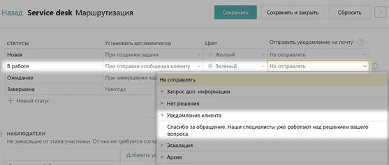 В настройках маршрутизации в разделе Статусы можно задать условие, что при смене статуса заявки, например на В работе, клиенту приходило письмо на электронную почту о том, что его проблема уже решается. Это сделает процесс обработки обращение более удобным и спокойным как для клиента, так и службы поддержки.